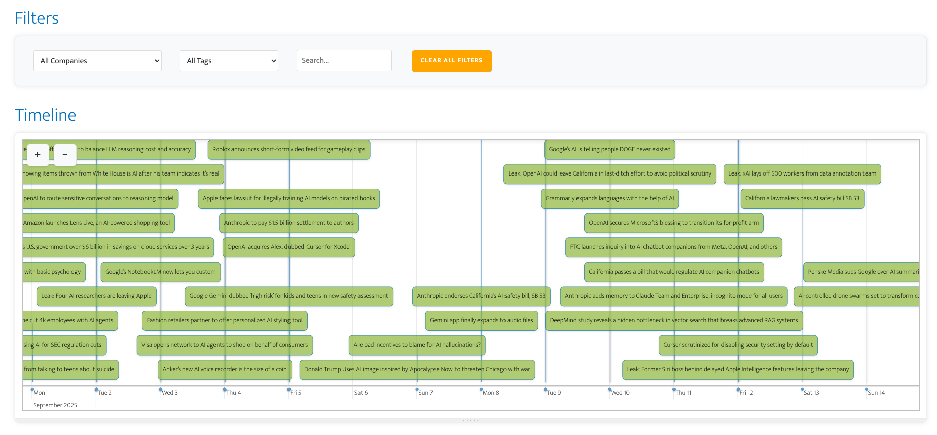 Keep your finger on the pulse of AI-related news, innovations, legislation, and more with my interactive AI Timeline. You can filter by company, roughly 100 tags (at the time of writing), as well as keywords—even bookmark updates that are most important to you (e.g., updates from DeepSeek, ‘AI for good’ advances that benefit society, video generation, legal action, etc).