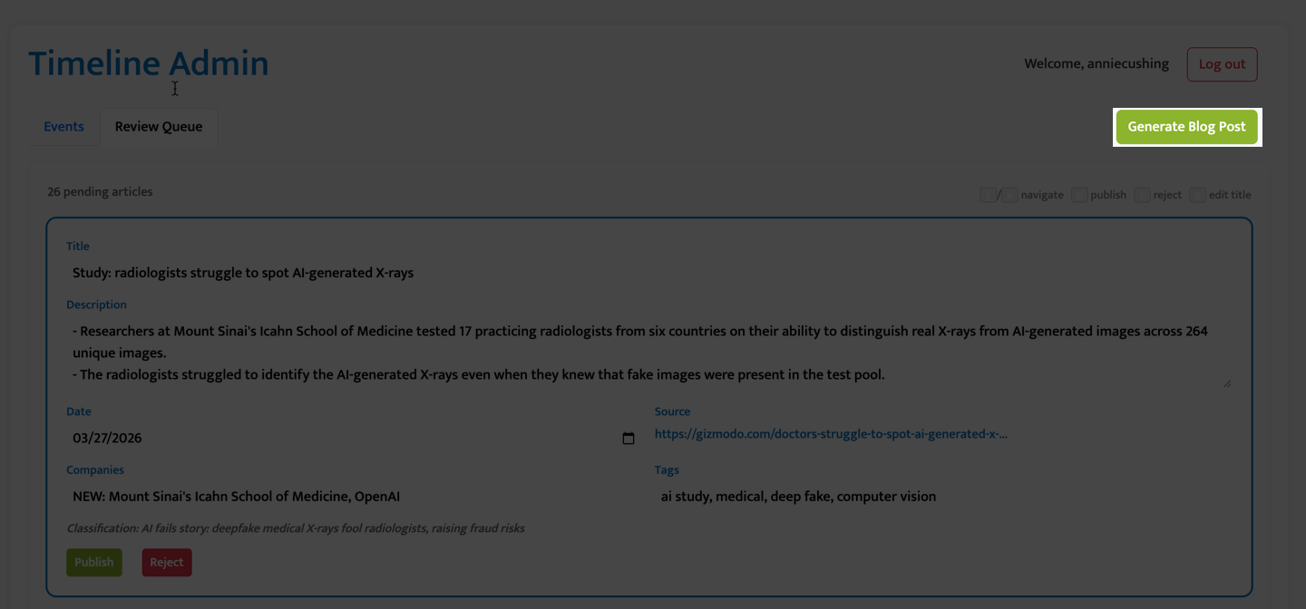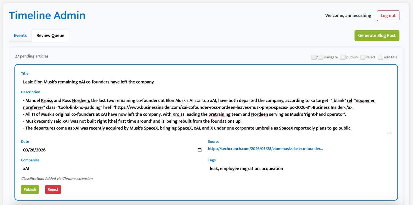 I decided that since I had already built the review queue, I’d simplify the Chrome extension by just saving the article to the review queue and editing it there. I need to fine-tune the model to better differentiate reports from leaks. (It thought this article was a report but it was a leak. It’s in the pipeline.)