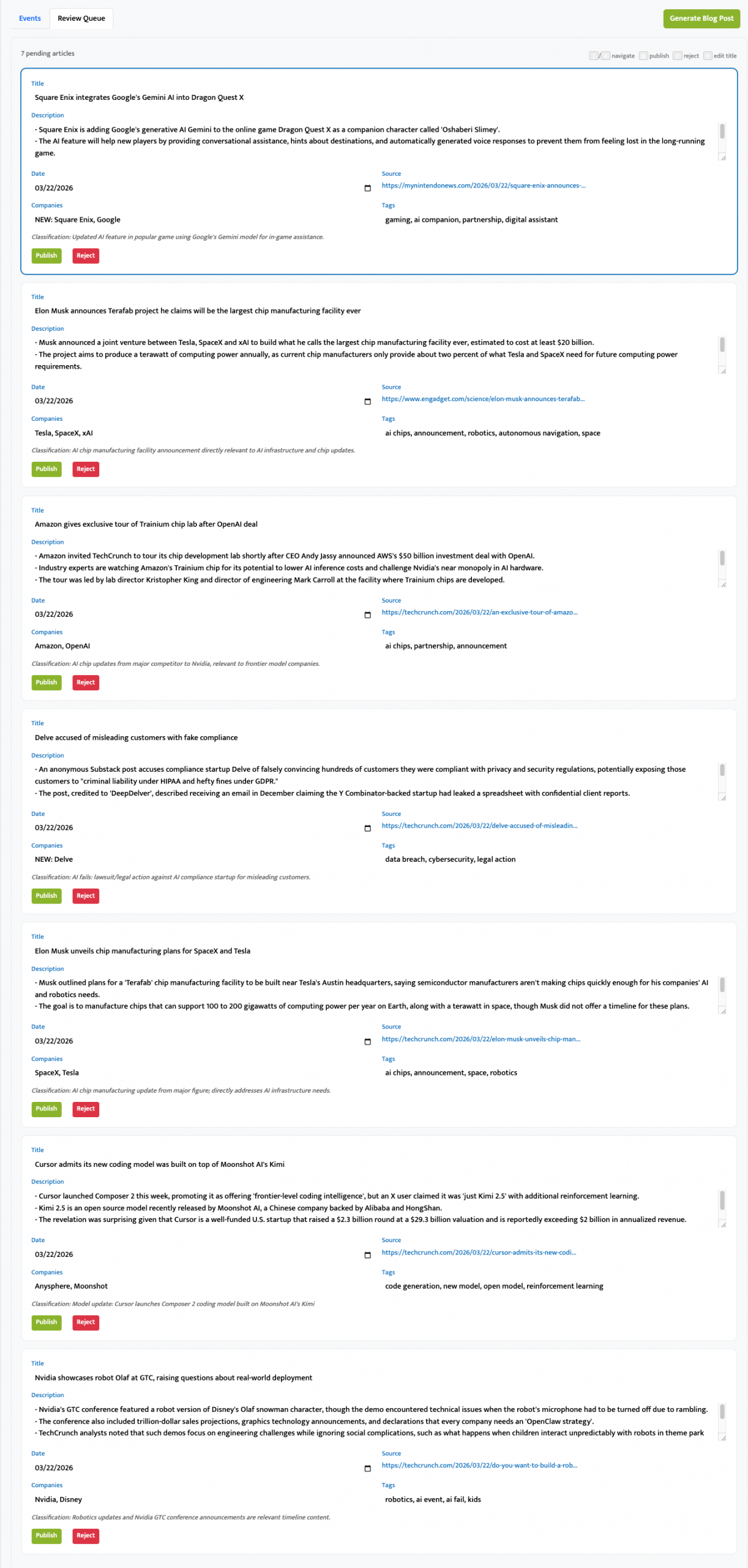 • I have 170 tags to choose from and canonical company names, so I’d need to be able to edit everything before anything goes live.