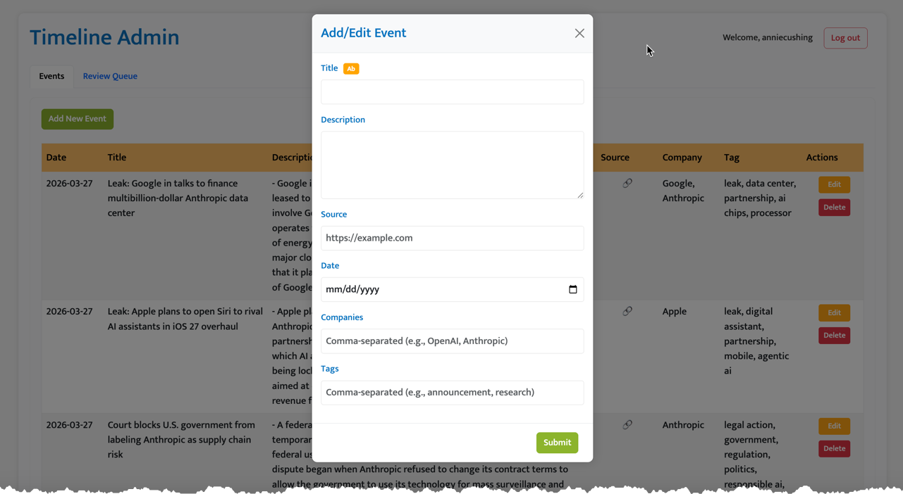 I have an admin area for my AI Timeline, with a simple modal I use to add events.