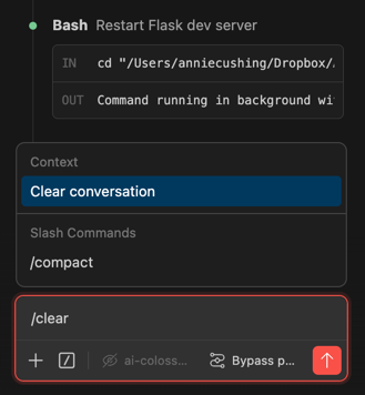 • Clear your context frequently: Every instruction you provide, prompt you send it, image you upload, etc adds to your context. And it’s context that causes you to deplete your tokens faster. In fact, when Anthropic CEO Dario Amodei announced the company was doubling the limits for Claude a couple weeks ago, I got a little lazy about clearing my context. And that was when I ran out of tokens. If you just enter ‘/clear’ (called a ‘slash command’), the option will surface to Clear Conversation. Do that. Often.