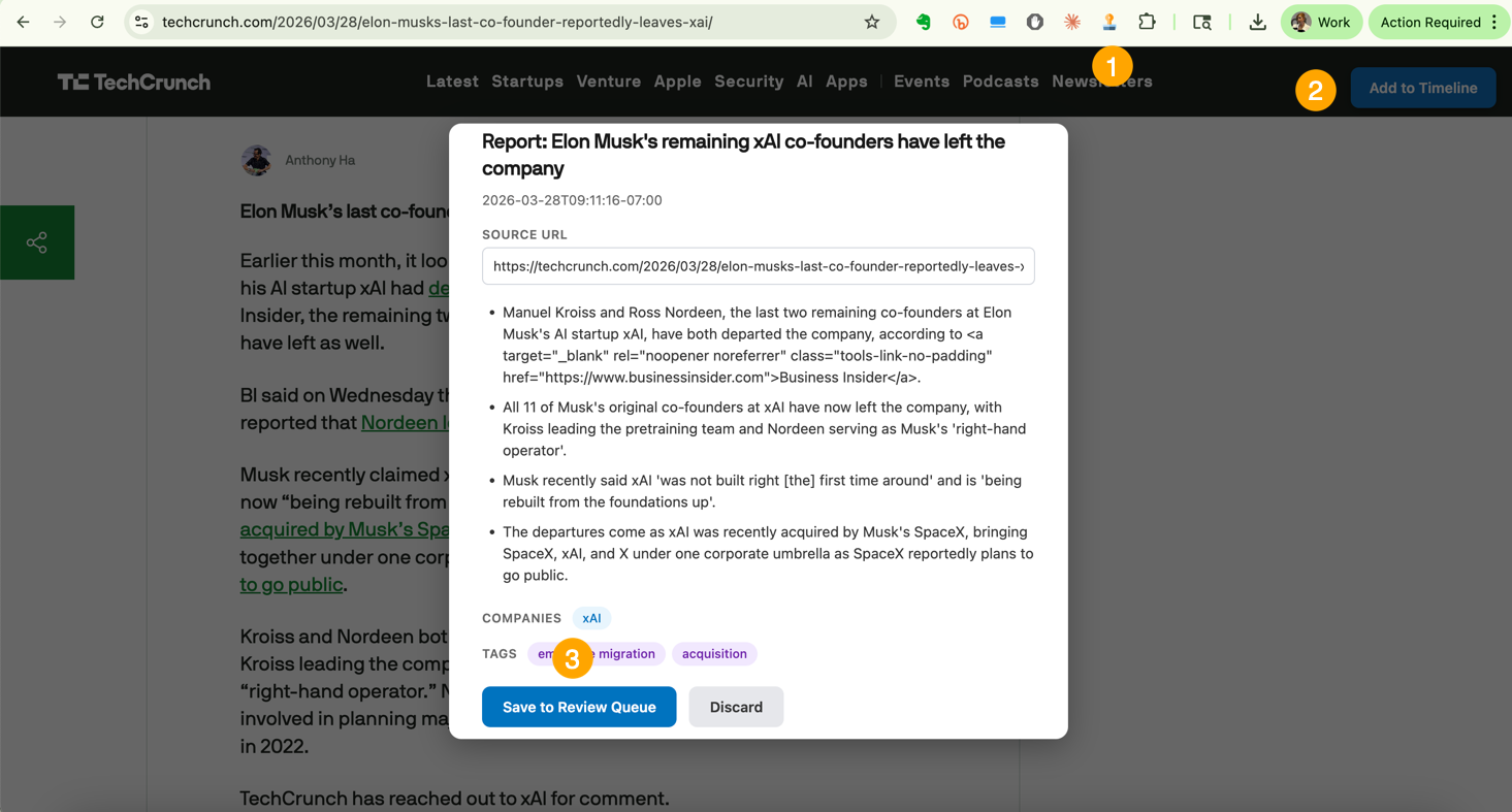 For sites that either blocked crawlers or weren’t included in my daily feed, I created a Chrome extension that allows me to scrape on the fly. If it’s in the list I provided in a markdown file, the Add to Timeline button appears in the upper-right corner automatically. If it’s not, I can click the stamp icon to summon it.